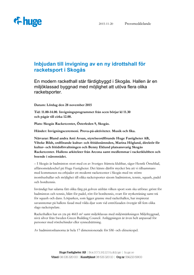 Inbjudan till invigning av en ny idrottshall för racketsport i Skogås