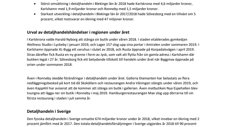 • Störst omsättning i detaljhandeln i Blekinge län år 2018 hade Karlskrona med 4,6 miljarder kronor, Karlshamn med 1,9 miljarder kronor och Ronneby med 1,5 miljarder kronor.