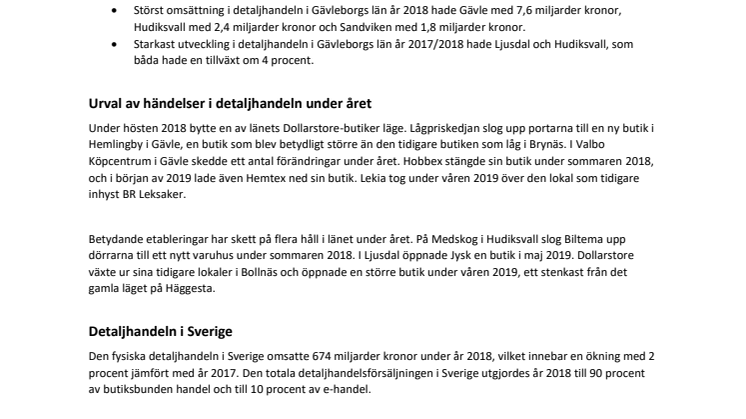 • Störst omsättning i detaljhandeln i Gävleborgs län år 2018 hade Gävle med 7,6 miljarder kronor, Hudiksvall med 2,4 miljarder kronor och Sandviken med 1,8 miljarder kronor.