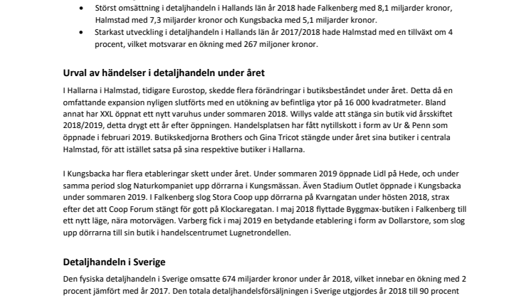 • Störst omsättning i detaljhandeln i Hallands län år 2018 hade Falkenberg med 8,1 miljarder kronor, Halmstad med 7,3 miljarder kronor och Kungsbacka med 5,1 miljarder kronor.