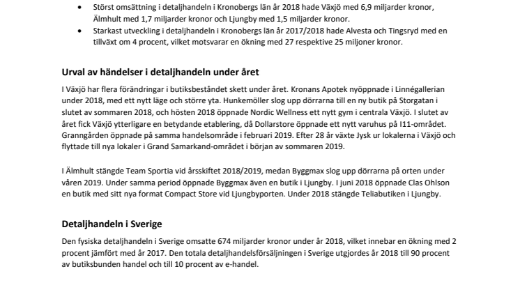 • Störst omsättning i detaljhandeln i Kronobergs län år 2018 hade Växjö med 6,9 miljarder kronor, Älmhult med 1,7 miljarder kronor och Ljungby med 1,5 miljarder kronor.