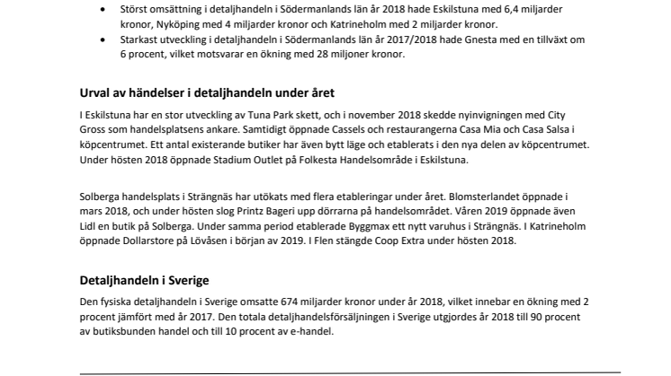 • Störst omsättning i detaljhandeln i Södermanlands län år 2018 hade Eskilstuna med 6,4 miljarder kronor, Nyköping med 4 miljarder kronor och Katrineholm med 2 miljarder kronor.