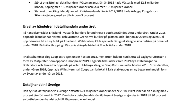• Störst omsättning i detaljhandeln i Västmanlands län år 2018 hade Västerås med 12,8 miljarder kronor, Köping med 1,5 miljarder kronor och Sala med 1,3 miljarder kronor.