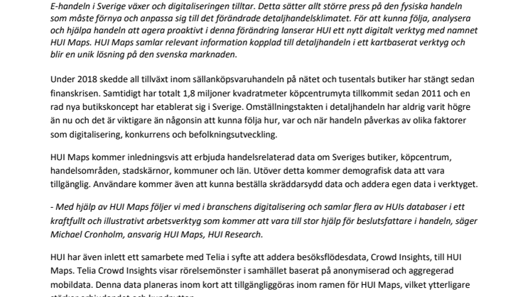 E-handeln i Sverige växer och digitaliseringen tilltar. Detta sätter allt större press på den fysiska handeln som måste förnya och anpassa sig till det förändrade detaljhandelsklimatet. För att kunna följa, analysera och hjälpa handeln att agera proaktivt i denna förändring lanserar HUI ett nytt digitalt verktyg med namnet HUI Maps. HUI Maps samlar relevant information kopplad till detaljhandeln i ett kartbaserat verktyg och blir en unik lösning på den svenska marknaden.