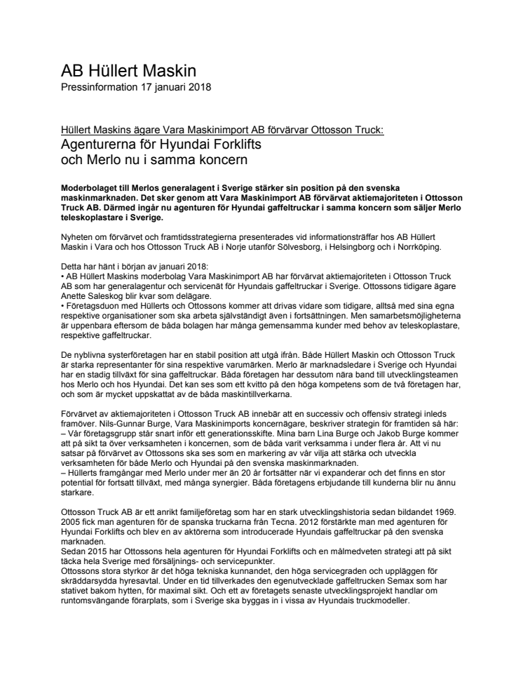Moderbolaget till Merlos generalagent i Sverige stärker sin position på den svenska maskinmarknaden. Det sker genom att Vara Maskinimport AB förvärvat aktiemajoriteten i Ottosson Truck AB. Därmed ingår nu agenturen för Hyundai gaffeltruckar i samma koncern som säljer Merlo teleskoplastare i Sverige.