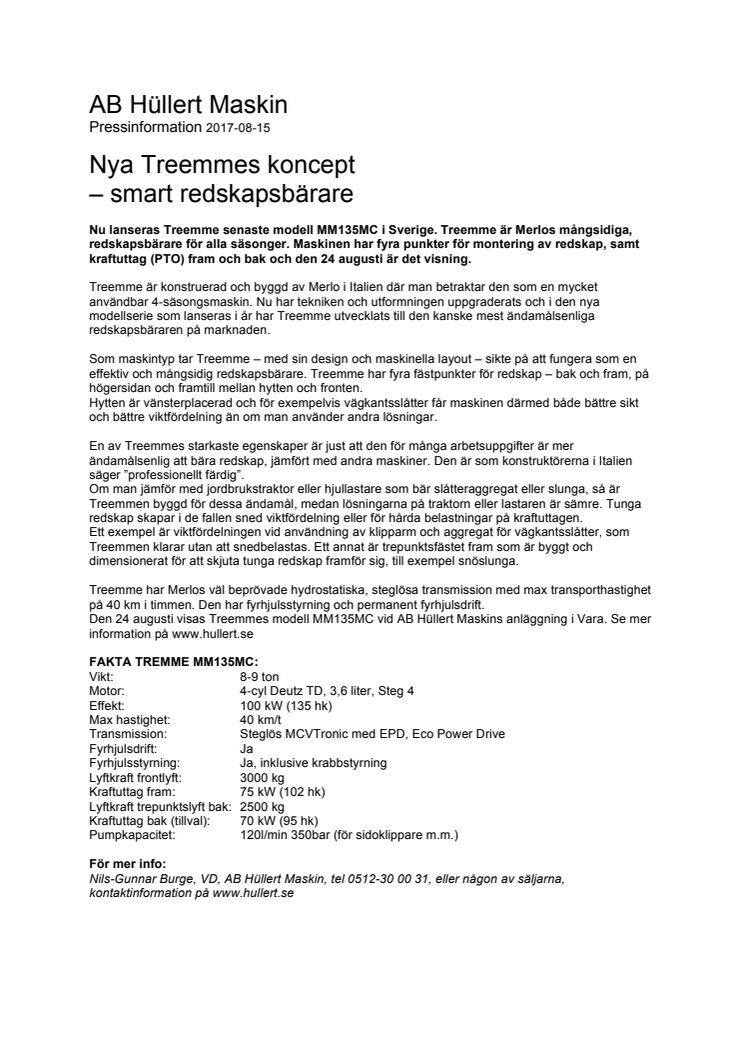 Nu lanseras Treemme senaste modell MM135MC i Sverige. Treemme är Merlos mångsidiga, redskapsbärare för alla säsonger. Maskinen har fyra punkter för montering av redskap, samt kraftuttag (PTO) fram och bak och den 24 augusti är det visning.