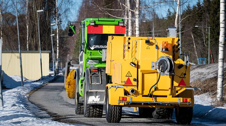 – När vi fick det här uppdraget köpte vi en sopvals från Holms som passade för jobbet. Beställaren, Svevia, håller oss med saltvagnen, som är av märket Falköping, fortsätter Mattias Hallin.