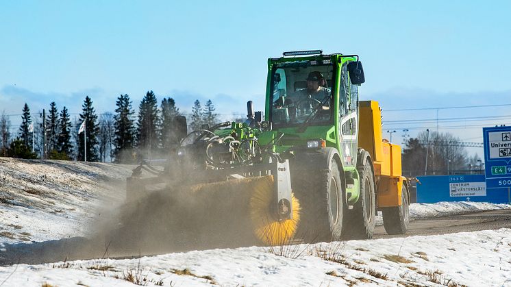 Inför vintersäsongen fick Grus Schakt i Umeå i uppdrag att sopsalta stadens gång- och cykelbanor. Den maskin som var mest lämpad för jobbet var företagets Merlo TF38.10 som utrustades med sopvals och saltvagn.
