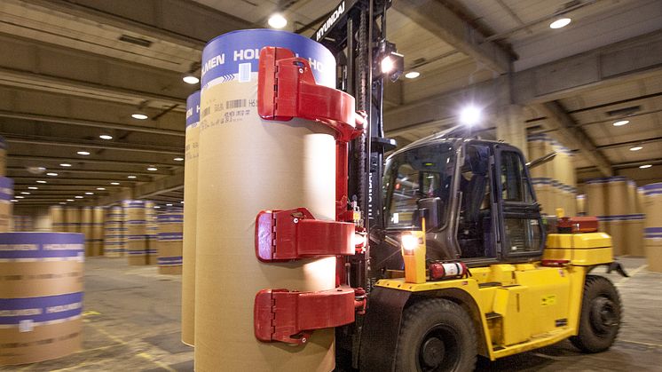 Majoriteten av rullarna hanteras stående och truckarna är utrustade med dubbla klämaggregat. Totalt hanteras 600 000 ton pappersrullar varje år, så kraven på truckarna och logistiken inom pappersbruket är höga. Driften pågår dygnet runt alla dagar hela året.