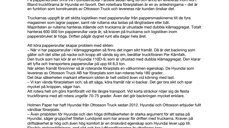 Holmen Paper har haft Hyundai från Ottosson Truck sedan 2012. Hyundai och Ottosson erbjuder fullt vändbar förarplats.
