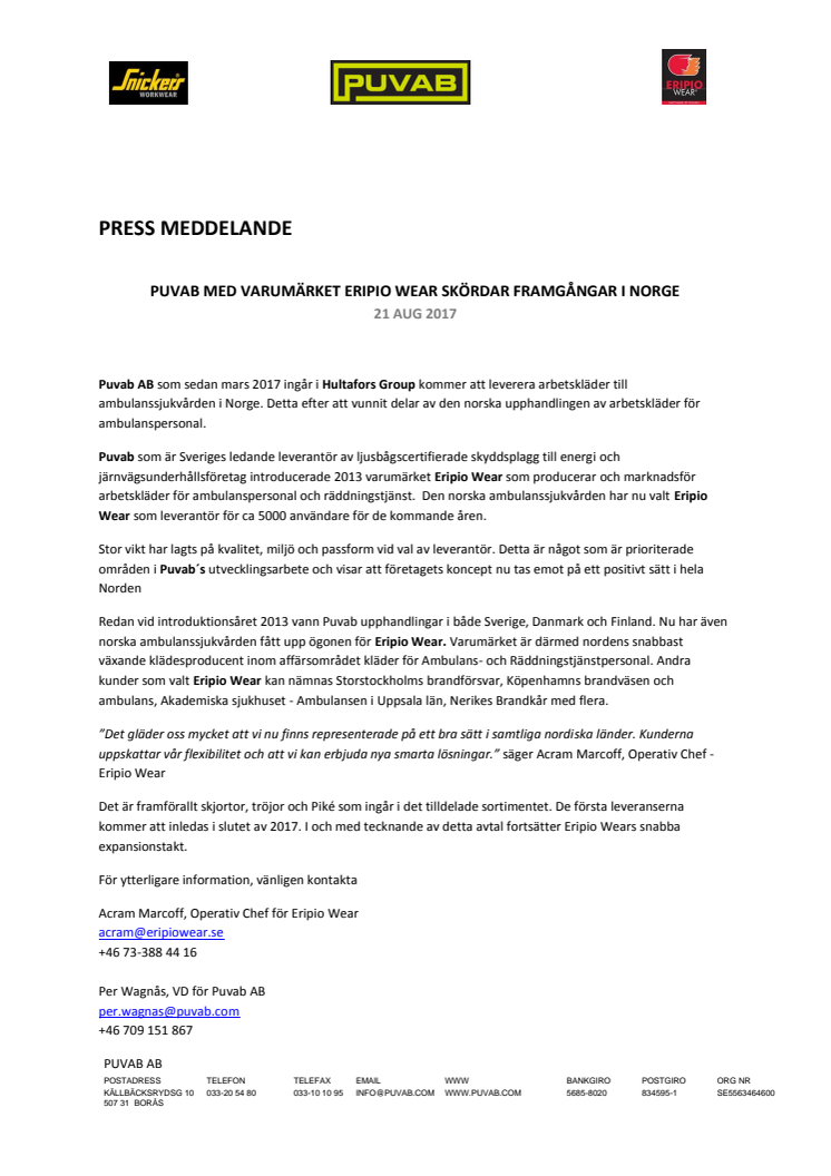 Puvab AB som sedan mars 2017 ingår i Hultafors Group kommer att leverera arbetskläder till ambulanssjukvården i Norge. Detta efter att vunnit delar av den norska upphandlingen av arbetskläder för ambulanspersonal.