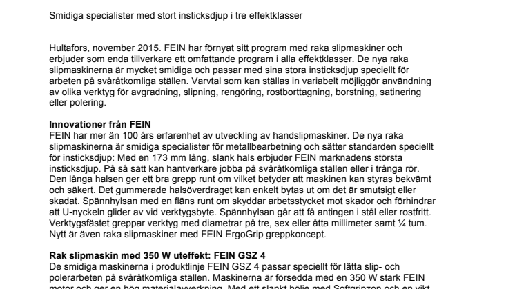 Hultafors, november 2015. FEIN har förnyat sitt program med raka slipmaskiner och