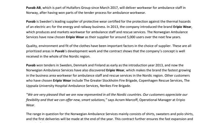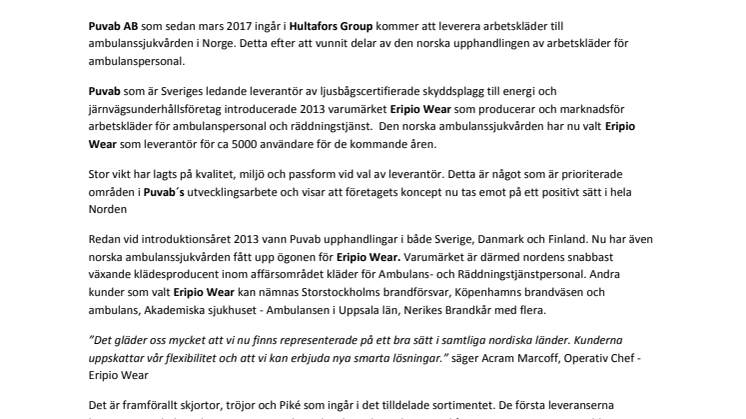 Puvab AB som sedan mars 2017 ingår i Hultafors Group kommer att leverera arbetskläder till ambulanssjukvården i Norge. Detta efter att vunnit delar av den norska upphandlingen av arbetskläder för ambulanspersonal. Puvab som är Sveriges ledande leverantör av ljusbågscertifierade skyddsplagg till energi och järnvägsunderhållsföretag introducerade 2013 varumärket Eripio Wear som producerar och marknadsför arbetskläder för ambulanspersonal och räddningstjänst. Den norska ambulanssjukvården har nu valt Eripio Wear som leverantör för ca 5000 användare för de kommande åren.
