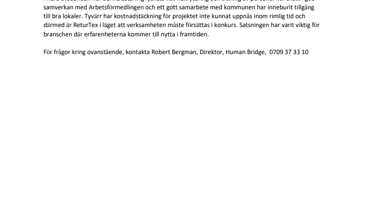Under flera år har ovanstående samarbetspartners varit engagerade i en process med att utveckla en kommersiell textilsorteringsverksamhet i Sverige. Human Bridge har sedan många år aktivt samlat in textilier för användning i biståndsinsatser samt för intäktsgenerering till täckning av biståndsprojekt. Boer Gruppen bedriver sorteringsanläggningar för textilier i flera länder i Europa. Tillsammans med textilsorteringskoncernen Boer Gruppen startades ReturTex sorteringsanläggning i Avesta för snart ett år sedan.