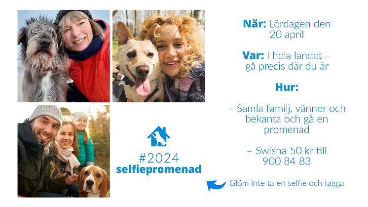 Idén med selfiepromenaden är att deltagaren tar en promenad tillsammans med sin hund, vänner och bekanta, fotograferar promenadgänget, och därefter publicerar bilden på Instagram med hashtag #2024selfiepromenad. För att stödja alla hundars rätt till veterinärvård, uppmanas varje promenaddeltagare att swisha 50 kr till 900 84 83.