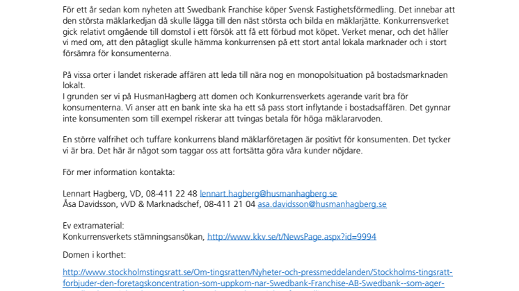 Vi på HusmanHagberg anser att Konkurrensverkets granskning av affären mellan Swedbank Franchise och Svensk Fastighetsförmedling varit positiv för hela branschen och välkomnar domen. Nu undviks en osund konkurrenssituation på bostadsmarknaden där konsumenten hade blivit en stor förlorare utan valfrihet på en marknad med en dominerande aktör. Det är även positivt att vi nu slipper se Swedbank som dominerande ägare av bostadssajten Hemnet.