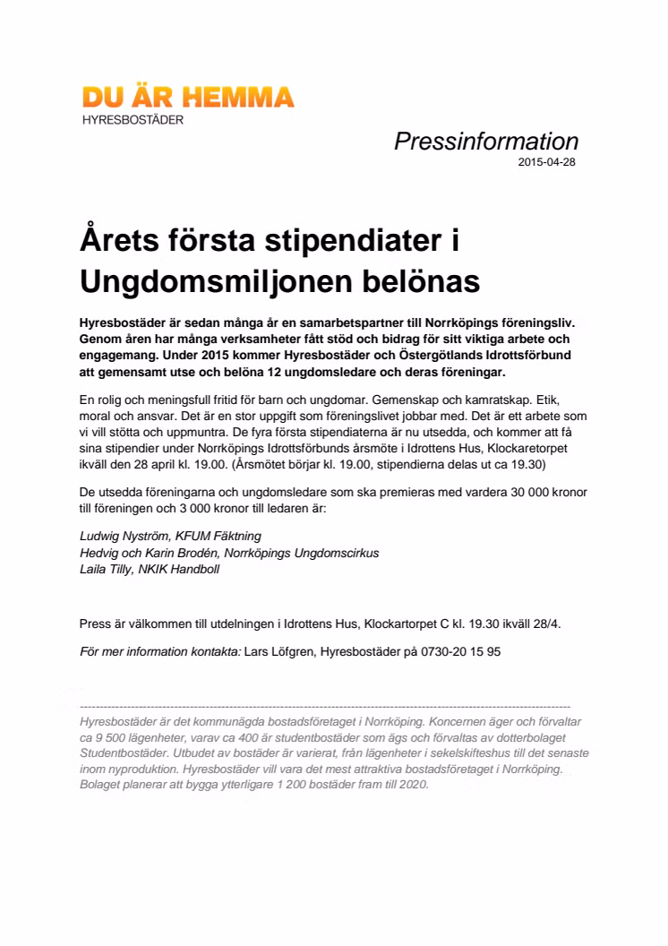 Hyresbostäder är sedan många år en samarbetspartner till Norrköpings föreningsliv. Genom åren har många verksamheter fått stöd och bidrag för sitt viktiga arbete och engagemang. Under 2015 kommer Hyresbostäder och Östergötlands Idrottsförbund att gemensamt utse och belöna 12 ungdomsledare och deras föreningar.