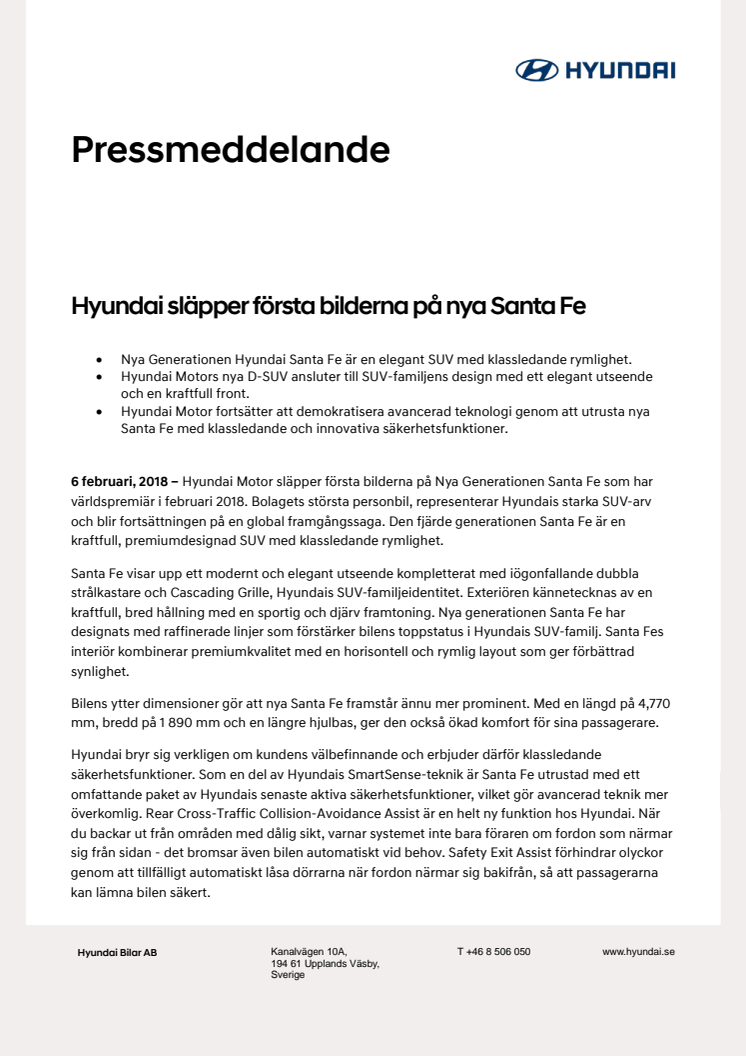 Nya Generationen Hyundai Santa Fe är en elegant SUV med klassledande rymlighet. Hyundai Motors nya D-SUV ansluter till SUV-familjens design med ett elegant utseende och en kraftfull front. Hyundai Motor fortsätter att demokratisera avancerad teknologi genom att utrusta nya Santa Fe med klassledande och innovativa säkerhetsfunktioner.