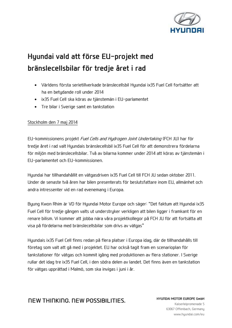 Hyundai vald att förse EU-projekt med bränslecellsbilar för tredje året i rad
