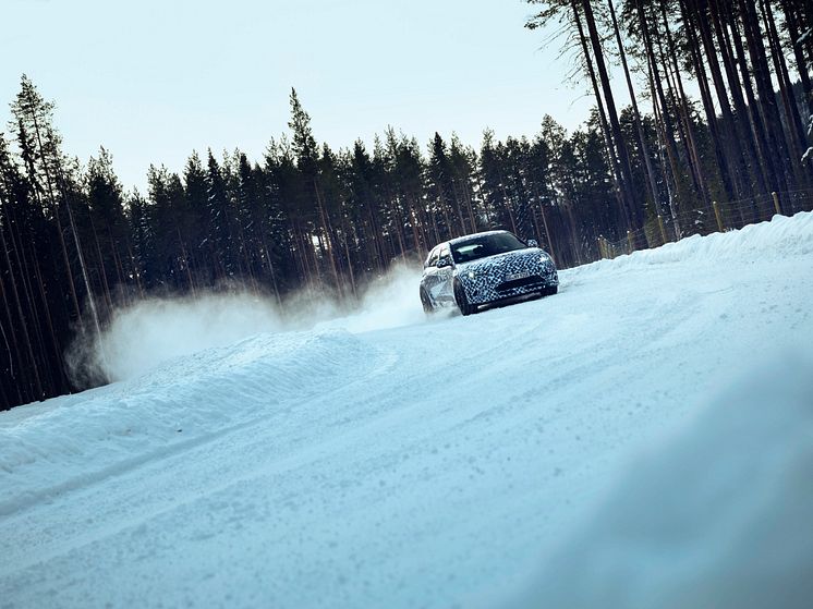 En prototyp av Hyundais helelektriska prestandabil - IONIQ 5 N vintertestas på Arjeplogs frusna sjöar.