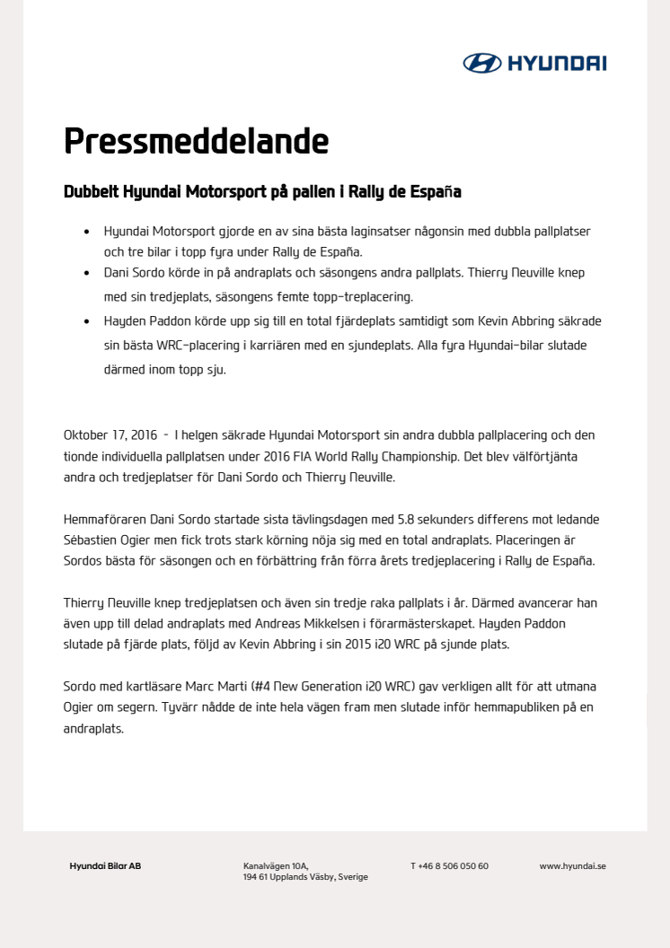 - Hyundai Motorsport gjorde en av sina bästa laginsatser någonsin med dubbla pallplatser och tre bilar i topp fyra under Rally de España.