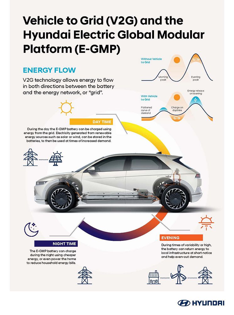 Electric Global Modular Platform (E-GMP), Hyundai Motor Groups första BEV-dedikerade plattform har redan Vehicle-to-Load-teknik (V2L) som möjliggör dubbelriktad laddning. Därför är det redan planlagt sedan tidigare att den dubbelriktade ombordladdaren som möjliggör V2L, kan stödja V2G i framtiden. V2L och V2G har liknande tekniska principer för omvänd kraftöverföring men med olika mjukvara. Eftersom V2G behöver förse elnätet med energi måste ett kommunikationsprotokoll mellan elbilen och nätet först definieras.