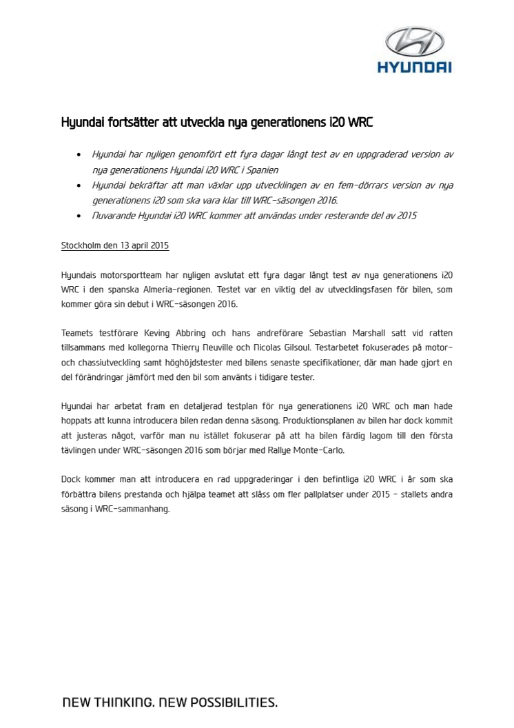 Teamchefen Michel Nandan säger: ”det var en väldigt detaljerad testvecka i Spanien nyligen när vår uppgraderade, nya generationens Hyundai i20 WRC nötte vägarna i Almeria-regionen. Kevin och Thierry jobbade med motor- och chassiutveckling samt höghöjdstester, och testdatan kommer att användas för en vidareutveckling av bilen under resten av året. Vårt fokus ligger nu på att utveckla fem-dörrars versionen tillräckligt så att den kan tävla i Monte-Carlo nästa år. Vi hade hoppats på att kunna lansera bilen redan i år, men då vi nu har ytterligare några månader på oss för utveckling hoppas vi kunna leverera en riktigt bra bil till premiären av säsongen 2016.