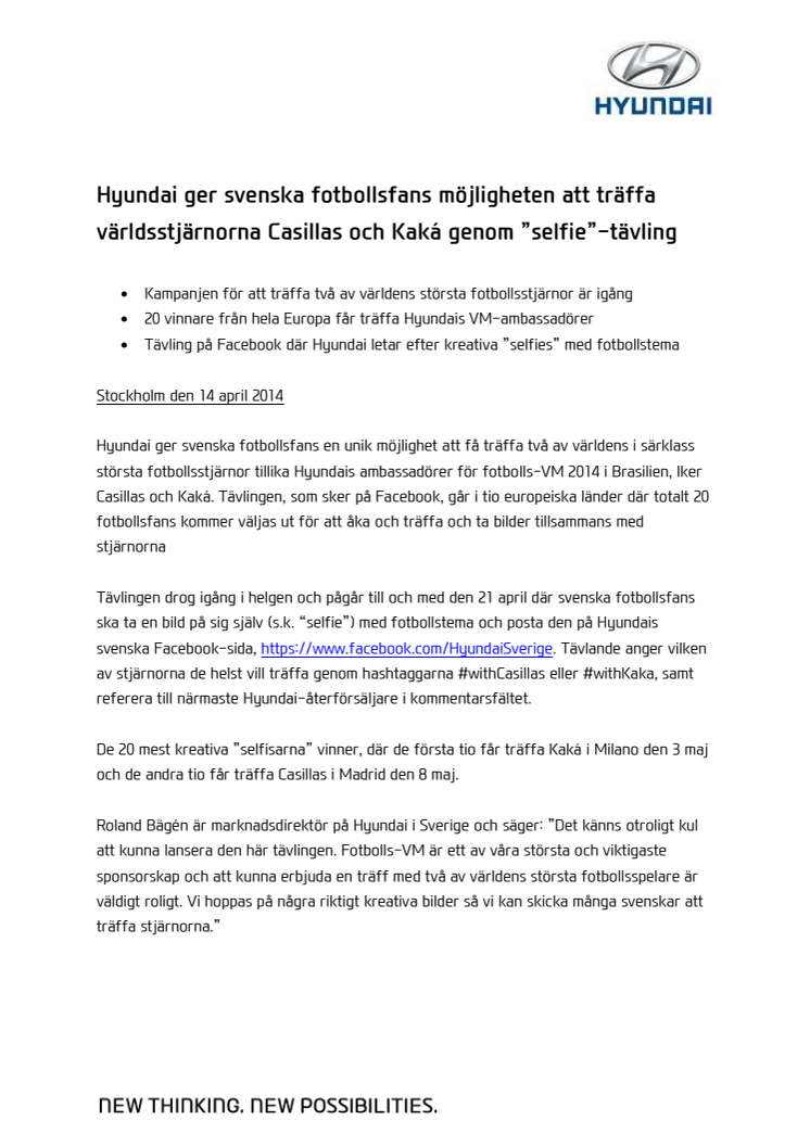 Hyundai ger svenska fotbollsfans en unik möjlighet att få träffa två av världens i särklass största fotbollsstjärnor tillika Hyundais ambassadörer för fotbolls-VM 2014 i Brasilien, Iker Casillas och Kaká. Tävlingen, som sker på Facebook, går i tio europeiska länder där totalt 20 fotbollsfans kommer väljas ut för att åka och träffa och ta bilder tillsammans med stjärnorna