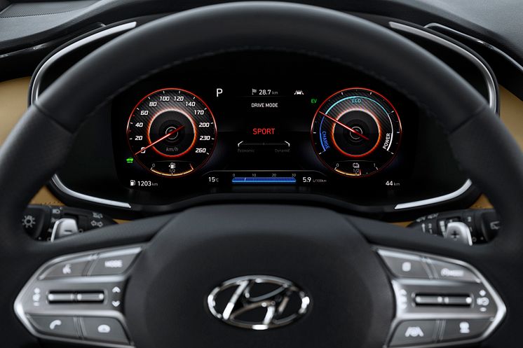 Nya Santa Fe erbjuder ännu mer utrymme, komfort och bekvämlighet jämfört med föregående modell. Den uppdaterade interiören förmedlar en helt ny känsla av lyx där varje komponent har omarbetats för att ge en premiumkänsla både visuellt och i känsla. Nya Santa Fe har fått en lägre instrumentpaneldesign, ny mittkonsol och en ny 10.25-tums pekskärm för AVN (Audio Video Navigation). Den svävande mittkonsolen med shift-by-wire-knappar är ansluten till instrumentpanelen i en jämn, svepande kurva. För första gången kommer nya Santa Fe med en Terrain Mode-väljare: ett kontrollvred placerat i mittkonsolen för att bekvämt låta föraren växla mellan olika körlägen.