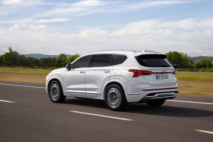 Med bredare hjulhus och nya lättmetallfälgar, inklusive 20-tumsfälgar som tillval förstärks den redan kraftfulla karaktären hos nya Santa Fe. Baktill bidrar den nya bakljusdesignen och horisontellt utsträckt grafik till att framhäva karossens bredd. En röd reflektor har dessutom adderats för att visuellt sammankoppla bakljusen. För att uppnå harmoni och förfinad känsla har Hyundais designers skapat en bakre stötfångare med fokus på att uppnå en lugnare och mer sofistikerad design av bilens bakdel. En form som understryker bilens breda och muskulösa hållning. Genom sin förfinade exteriör demonstrerar nya Santa Fe den mognadsgrad och självsäkerhet som återspeglar Hyundais premiumkvalitet.