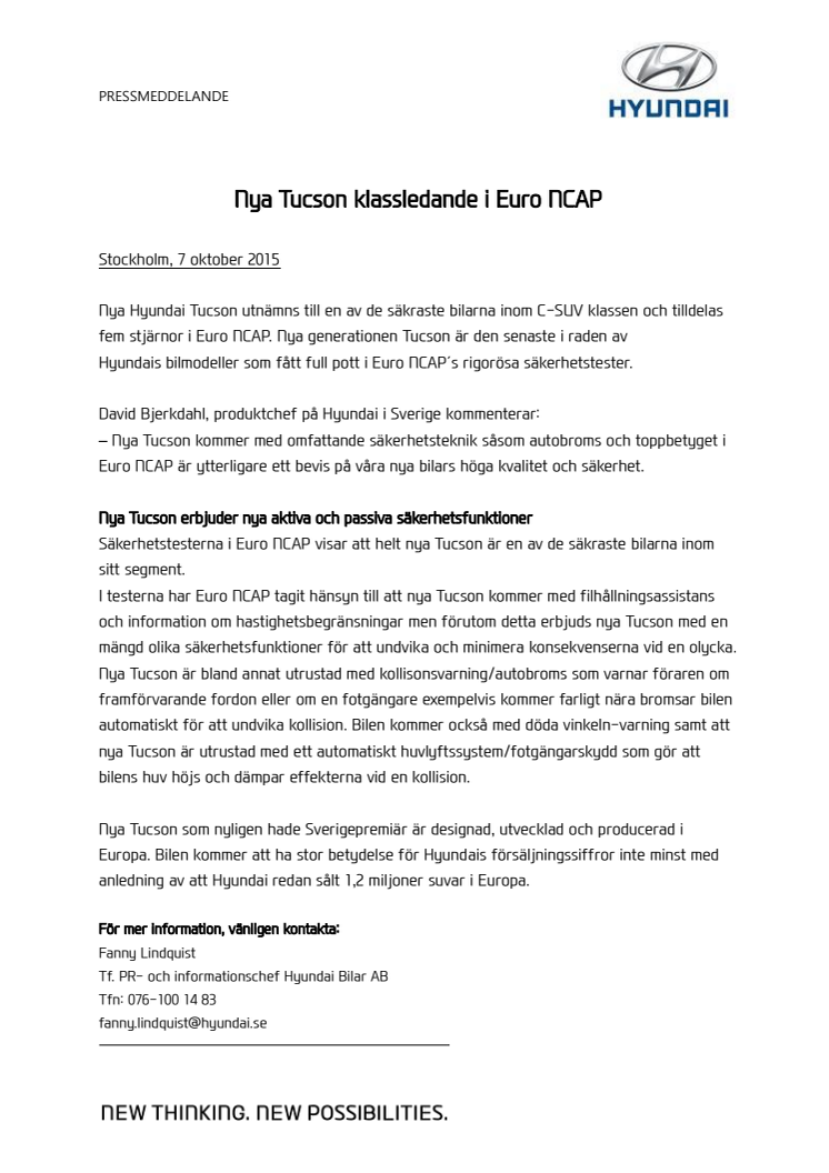 – Nya Tucson kommer med omfattande säkerhetsteknik såsom autobroms och toppbetyget i Euro NCAP är ytterligare ett bevis på våra nya bilars höga kvalitet och säkerhet.