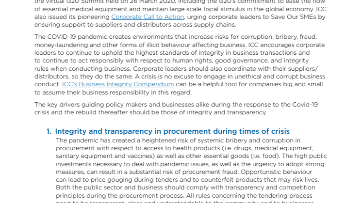 Den globala coronakrisen drabbar företag av alla storlekar över hela världen, troligtvis för en lång tid framöver. Det står utan tvivel att enorma resurser kommer att krävas från såväl privat som offentlig sektor för att lindra de ekonomiska följderna av Covid-19-krisen. Det riskerar att skapa miljöer som ökar risken för korruption, mutor, bedrägerier, penningtvätt och andra olagliga beteenden som kan drabba företag. Men en kris är inte en ursäkt att agera oetiskt eller korrupt.