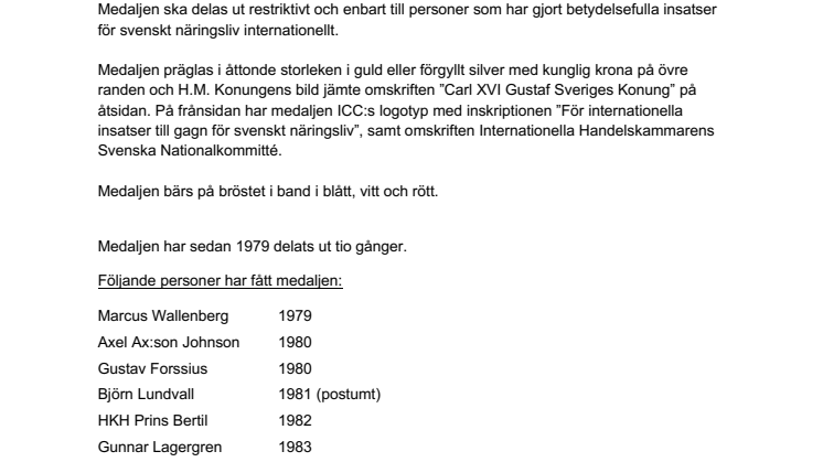 Måndag den 25 mars, i samband med firandet av Internationella Handelskammarens 100-årsjubileum, mottar EU:s handelskommissionär Cecilia Malmström Svenska Internationella Handelskammarens (ICC) förtjänstmedalj från Kungen. Medaljen delas ut ”för internationella insatser till gagn för näringslivet”.