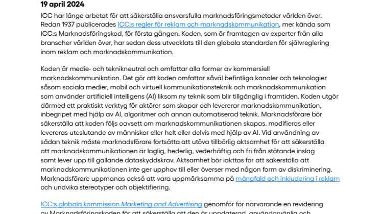 ICC uppmanar alla marknadsförare och involverade aktörer inom reklambranschen som designar, skapar, levererar eller kontrollerar marknadsföringskommunikation genom användning av AI, algoritmer och andra automatiserade teknologier att följa Marknadsföringskoden och fortsätta producera ansvarsfull marknadsföringskommunikation oavsett medel som används.