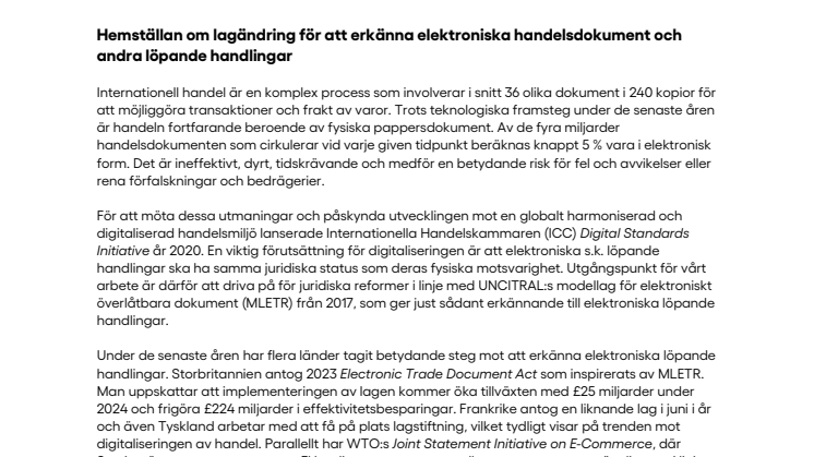 - Hemställan om lagändring för att erkänna elektroniska handelsdokument och andra löpande handlingar - ICC Sverige