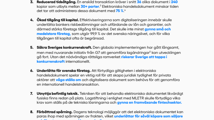 – De besparingar som digitaliseringen av handel bidrar med, både i tid och kostnader, kan inte underskattas, säger Susanna Zeko, generalsekreterare på ICC Sverige. Resten av världen har redan påbörjat digitaliseringen av handel. För att inte hamna på efterkälken måste även Sverige se över sin lagstiftning. Vi ser ett akut behov av att regeringen agerar för att säkerställa att svenska företag kan dra nytta av den fulla potentialen av digitalisering.