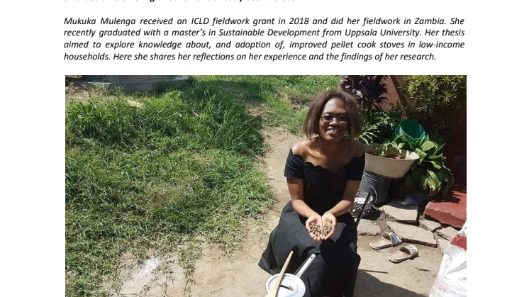 Mukuka Mulenga received an ICLD fieldwork grant in 2018 and did her fieldwork in Zambia. She recently graduated with a master’s in Sustainable Development from Uppsala University in Sweden. Her thesis aimed to explore knowledge about, and adoption of, improved pellet cook stoves in low-income households. Here she shares her reflections on her experience and the findings of her research.