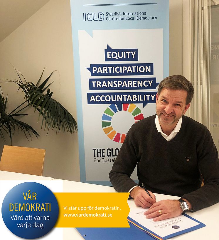 Johan skriver under deklarationen för Vår Demokrati