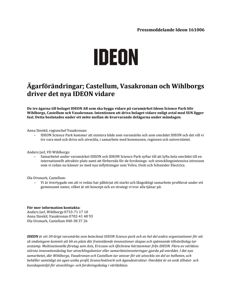 Ägarförändringar; Castellum, Vasakronan och Wihlborgs driver det nya IDEON vidare
