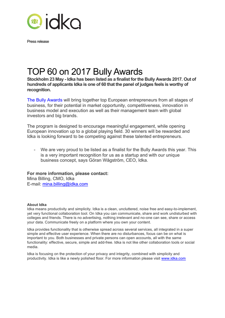 Idka has been listed as a finalist for the Bully Awards 2017. Out of hundreds of applicants Idka is one of 60 that the panel of judges feels is worthy of recognition.