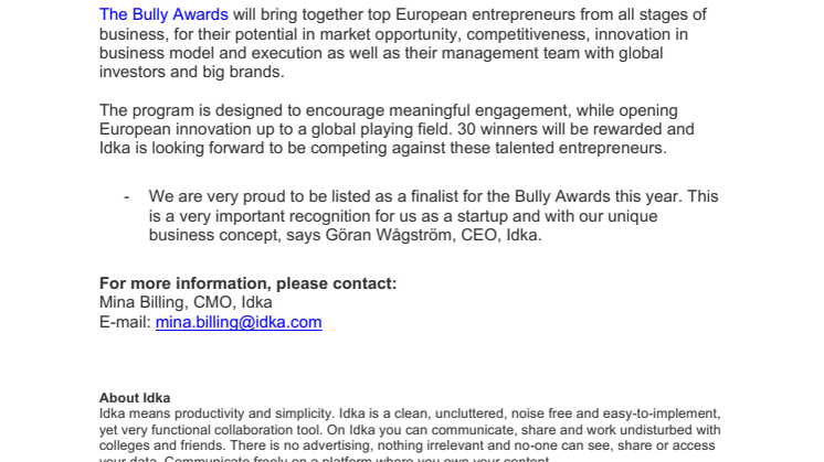 - We are very proud to be listed as a finalist for the Bully Awards this year. This is a very important recognition for us as a startup and with our unique business concept, says Göran Wågström, CEO, Idka.