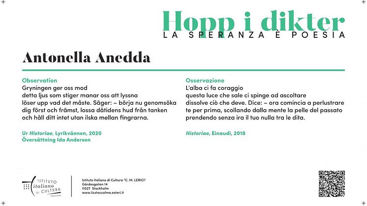 För institutets projekt - "La speranza è poesia / Hopp i dikter" valdes italienska författare översatta till svenska med en stark minnesväckande kraft. Historiae (Einaudi, 2018) är en samling av Antonella Anedda, en av de viktigaste samtida italienska kvinnliga diktare vars verser är byggda som en bildsekvens "som kastar ljus på det man inte vill se”. Hennes dikter verkar blanda olika språk, hon växlar mellan olika dialekter och sträcker sig från den offentliga till den privata sfären. Boken publicerades nyligen i Sverige av Lyrikvännen, med översättning av Ida Andersen och Nina M. Olsson.