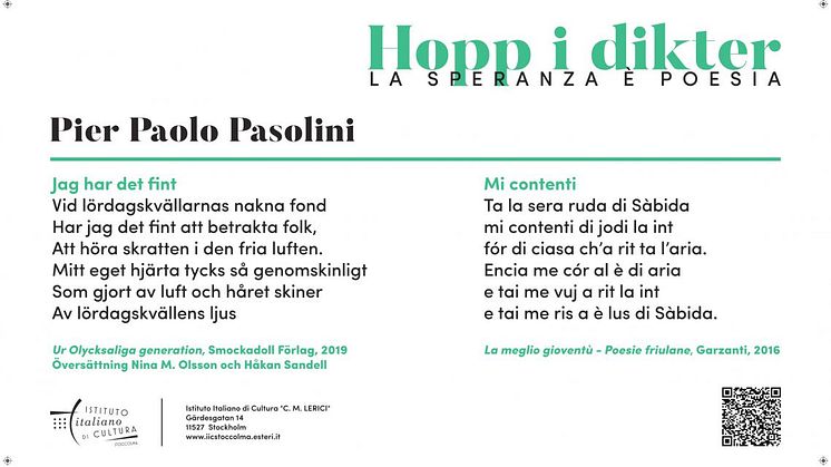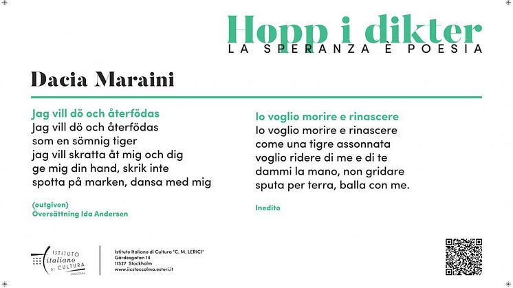 “La speranza è poesia / Hopp i dikter" är italienska kulturinstitutets nya projekt som tar poesin till Stockholms tunnelbanor från den 18:e till 31:a januari 2021. Fem dikter, på italienska och svenska kommer att visas som affischer på tvåtusen av reklamplatserna i den svenska huvudstadens kollektivtrafik. De utvalda författarna är Antonella Anedda, Valerio Magrelli, Alda Merini, Pier Paolo Pasolini och Dacia Marainisom har komponerat en opublicerad dikt för detta tillfälle.