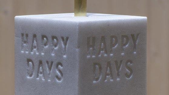 Happy Days S.B. by Marzia Migliora is part of her large installation Lo spettro di Malthus, la gabbia, that is currently exhibited at the Serlachius Museums in Mänttä, Finland. The phrase Happy Days S.B. is a quote from Samuel Beckett's play. The artist engraved it on the four sides of a salt’s block, that is commonly used as a food supplement in horse breeding. Horses consume the block by licking it, until it completely disappears. The work refers to an illusory and fleeting vision of happiness and wealth: in the past, salt was the first exchange and trade object among peoples. Happy Days can sarcastically be referred to these days of fear and confinement in Italy.