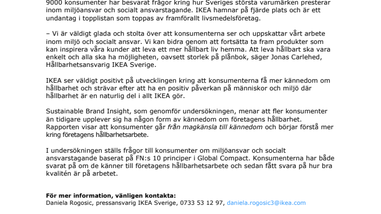 – Vi är väldigt glada och stolta över att konsumenterna ser och uppskattar vårt arbete inom miljö och socialt ansvar. Vi kan bidra genom att fortsätta ta fram produkter som kan inspirera våra kunder att leva ett mer hållbart liv hemma. Att leva hållbart ska vara enkelt och alla ska ha möjligheten, oavsett storlek på plånbok, säger Jonas Carlehed, Hållbarhetsansvarig IKEA Sverige.