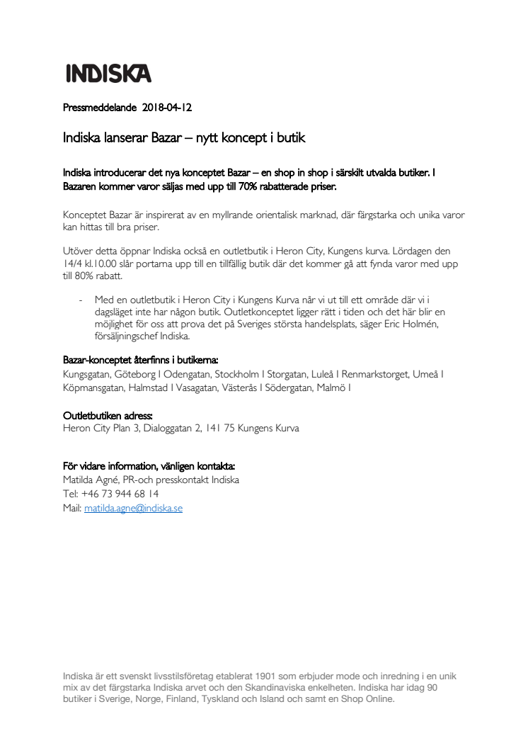 Indiska introducerar det nya konceptet Bazar – en shop in shop i särskilt utvalda butiker. I Bazaren kommer varor säljas med upp till 70% rabatterade priser.