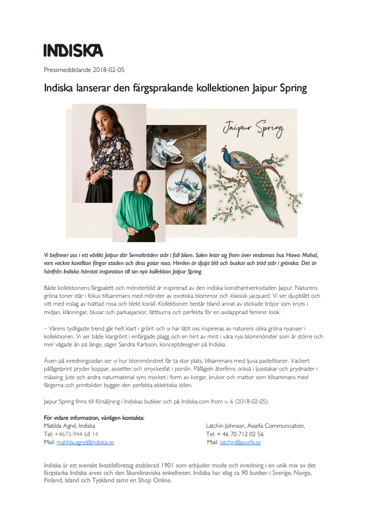 Vi befinner oss i ett vårlikt Jaipur där Semalträden står i full blom. Solen letar sig fram över vindarnas hus Hawa Mahal, vars vackra korallton färgar staden och dess gator rosa. Himlen är djupt blå och buskar och träd står i grönska. Det är härifrån Indiska hämtat inspiration till sin nya kollektion Jaipur Spring.