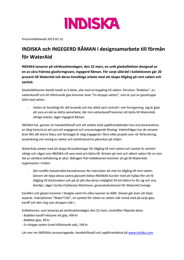 INDISKA lanserar på världsvattendagen, den 22 mars, en unik glaskollektion designad av en av våra främsta glasformgivare, Ingegerd Råman. För varje såld del i kollektionen går 20 procent till WaterAid och deras livsviktiga arbete med att skapa tillgång på rent vatten och sanitet.