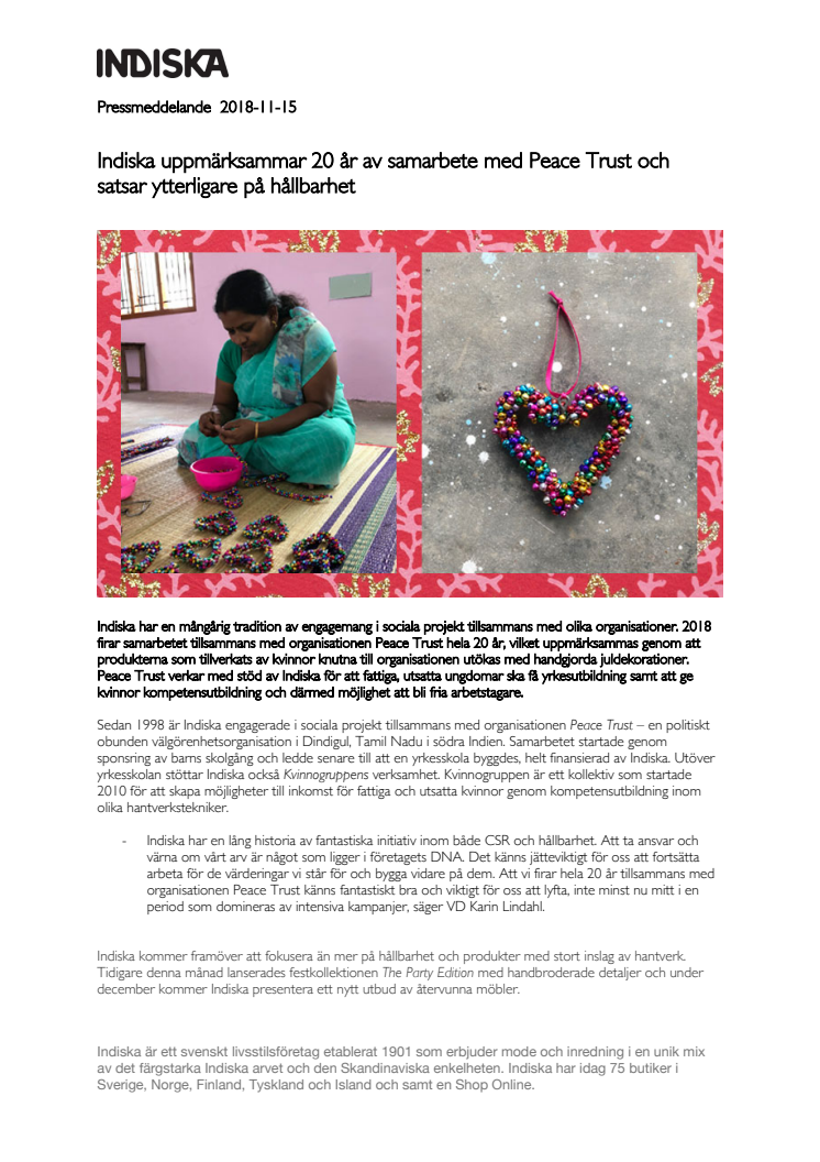 Indiska har en mångårig tradition av engagemang i sociala projekt tillsammans med olika organisationer. 2018 firar samarbetet tillsammans med organisationen Peace Trust hela 20 år, vilket uppmärksammas genom att produkterna som tillverkats av kvinnor knutna till organisationen utökas med handgjorda juldekorationer.