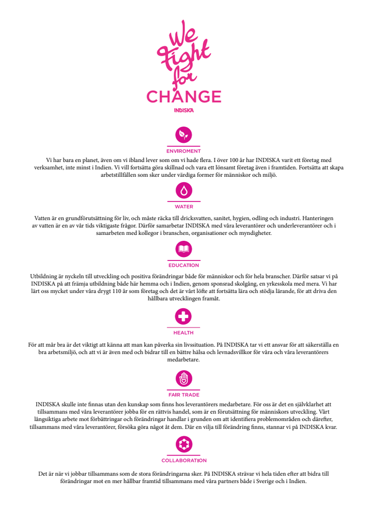 INDISKA:s hållbarhetsarbete sammanfattas på www.wefightforchange.com